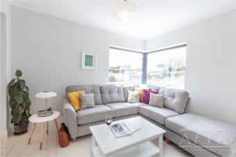 Off the entrance hall, the ground floor comprises a large open plan space, with lounge and dining areas to the front and back, with an impressively kitted-out kitchen in between. To the front, you first enter into a luxurious dining area with exquisitely upholstered comfortable dining chairs, for leisurely evenings dining in front of the window (oh, did we mention the view is amazing?), set off by chic pendant lights. A seating area to the front of the house is the perfect spot for a morning coffee or an aperitif. The decor is ocean-inspired, with elegant greys, blues picking up the colours of the sea.