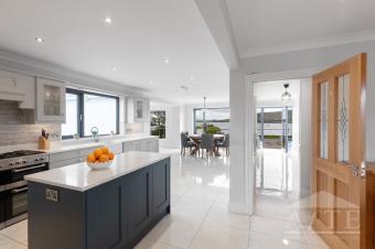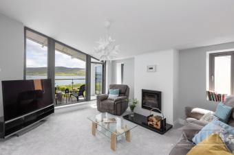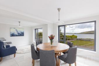 The wow factor hits you straight away! This is a house with stunning views, and combines generous windows and balconies to fill the spacious luxury interiors with light. Ideally located just minutes from Dingle town, on the western edge of Dingle Bay, at the start of the Slea Head Drive, the front of the house overlooks the bay straight ahead, and Eask Tower on the hill above. Early risers are guaranteed a spectacular sunrise. From the moment you step through the glass front door, surrounded by windows, into the spacious airy hallway, the message is clear—this is a house that loves the light, and takes full advantage of its location.