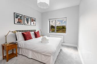 A few more steps lead up to the four beautifully appointed bedrooms. The plush carpeting continues, complemented by restful duck egg blue paint and contemporary abstract art prints. To the back there is a double bedroom and a single room, both catching the evening sun and west-facing hill views.