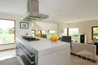The heart of this house is the huge open plan kitchen-dining-living room space. Entering from the main hallway, you first come to a double-height dining room, flooded with light from Velux windows in the roof. A round dining table seats seven very comfortably, with room for more if needed.