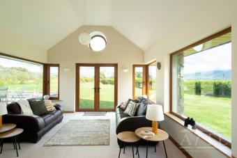 Lawns and gravel driveway surround the house, with barbecue and outdoor dining situated to the rear, accessible from the utility room and living room. There is ample parking for several cars in the gravelled drive.