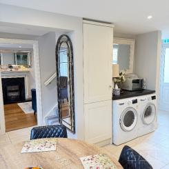 Full kitchen with single oven, electric hob, dishwasher, fridge freezer, washing machine and separate dryer. Iron and ironing board.