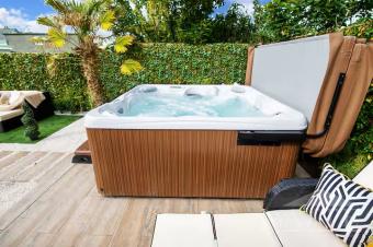 The garden features an outdoor dining area under a retractable roof. BBQ and wood-fired Pizza oven. Outdoor Bar and Jacuzzi with a 50 sq. foot projector screen to keep up with all the day's sports.