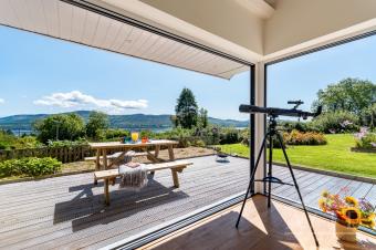 It has an open plan fully equipped kitchen, living room and dining room that seats 8, sunroom with high ceiling and concertina doors leading to a beautiful decking area with stunning panoramic views overlooking Kenmare Bay.