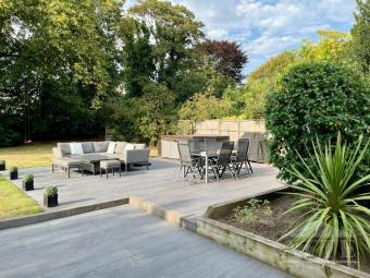 Large patio area with hot tub, bbq, table & chairs, outdoor sofa