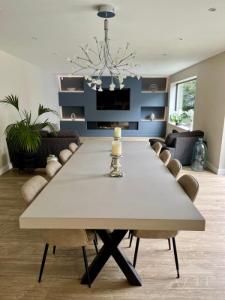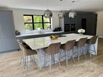 The kitchen area has a large island with seatign for 6. The large dining table has seat for 10 people.
