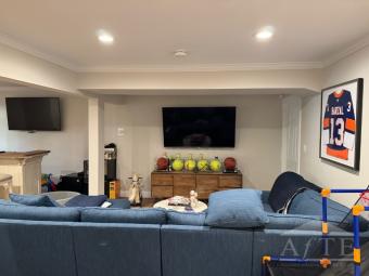 The house has an open floor plan with plenty of natural sunlight, an upper level with four large bedrooms, and a finished walk out basement with bedroom, bathroom, gym, and bar perfect for entertaining.