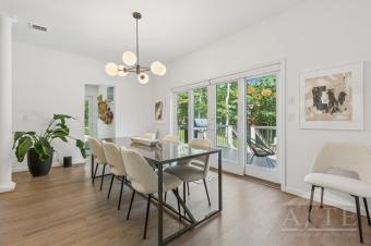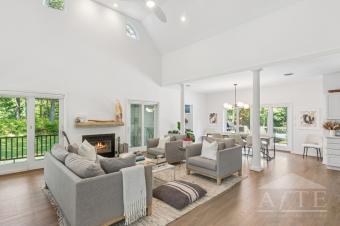 US Open Accommodation tucked away on a lush and private 1.09-acre parcel, this impeccably designed Post-Modern Farmhouse offers a first-floor primary suite including double vanities, a jetted soaking tub, and a private balcony overlooking the beautifully landscaped backyard and pool area. An additional 3 bedrooms and 3 full baths complete this 2,500± square foot open-concept home. A spacious dining area off the kitchen extends to an elevated deck with tranquil wooded views and a Weber grill. A media lounge with its own full bath offers added space for relaxation or guest accommodations. Multiple outdoor lounging and dining areas surround the heated pool and expansive decking.
