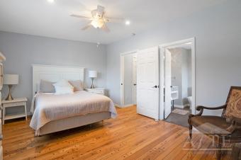 Primary bedroom features an en-suite bathroom with rain shower. Additional full bathrooms and a guest half-bath provide convenience for group stays.