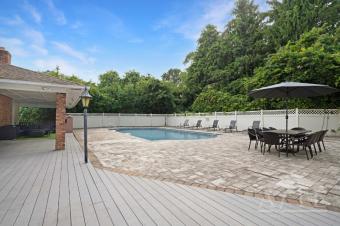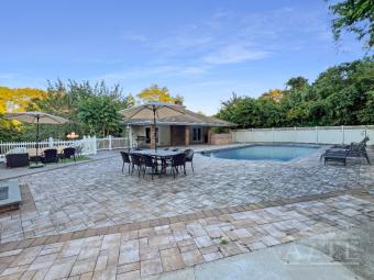 The backyard includes a large private pool (Memorial Day–Labor Day; unheated), paver patio with loungers, outdoor dining table for eight, and gas grill.