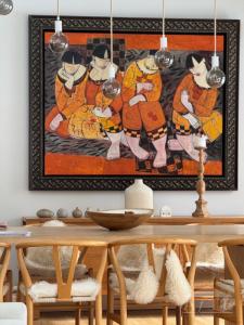 Upstairs, a workspace provides an ideal setting for remote work, while two bedrooms—including the primary—share a balcony and remain thoughtfully removed from the main living areas.