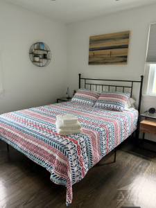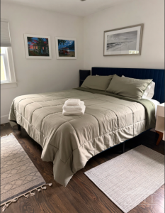 Inside, our charming Cape-style home accommodates up to 8 guests with four bedrooms: a king, a queen, a bunk room, and a queen downstairs.